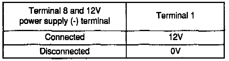 1. Connect a 12V power supply (+) terminal to the terminal 6 of the MFI control relay and measure the voltages at terminal 1 when the (-)terminal is connected to and disconnected from the terminal 8.