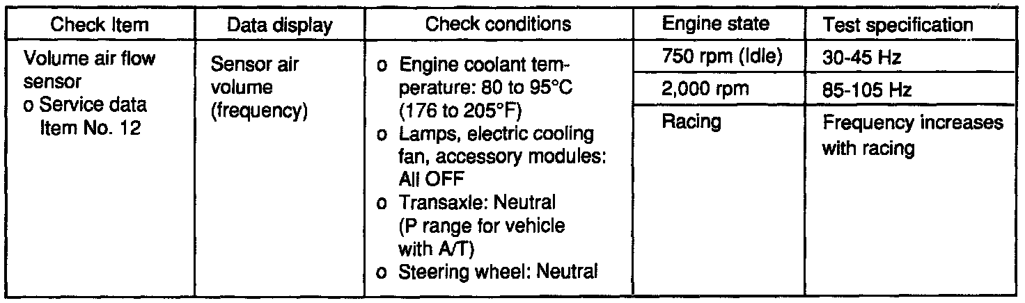 3. If the engine can be idle even if the volume air flow sensor Sensor output frequency is out of specification, check for the following conditions: