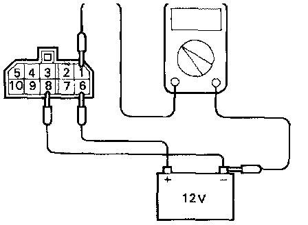 1. Connect a 12V power supply (+) terminal to the terminal 6 of the multipoint fuel injection control relay and measure the voltages at terminals 2 and 1 when the (-) terminal is connected to and disconnected from the terminal 8.