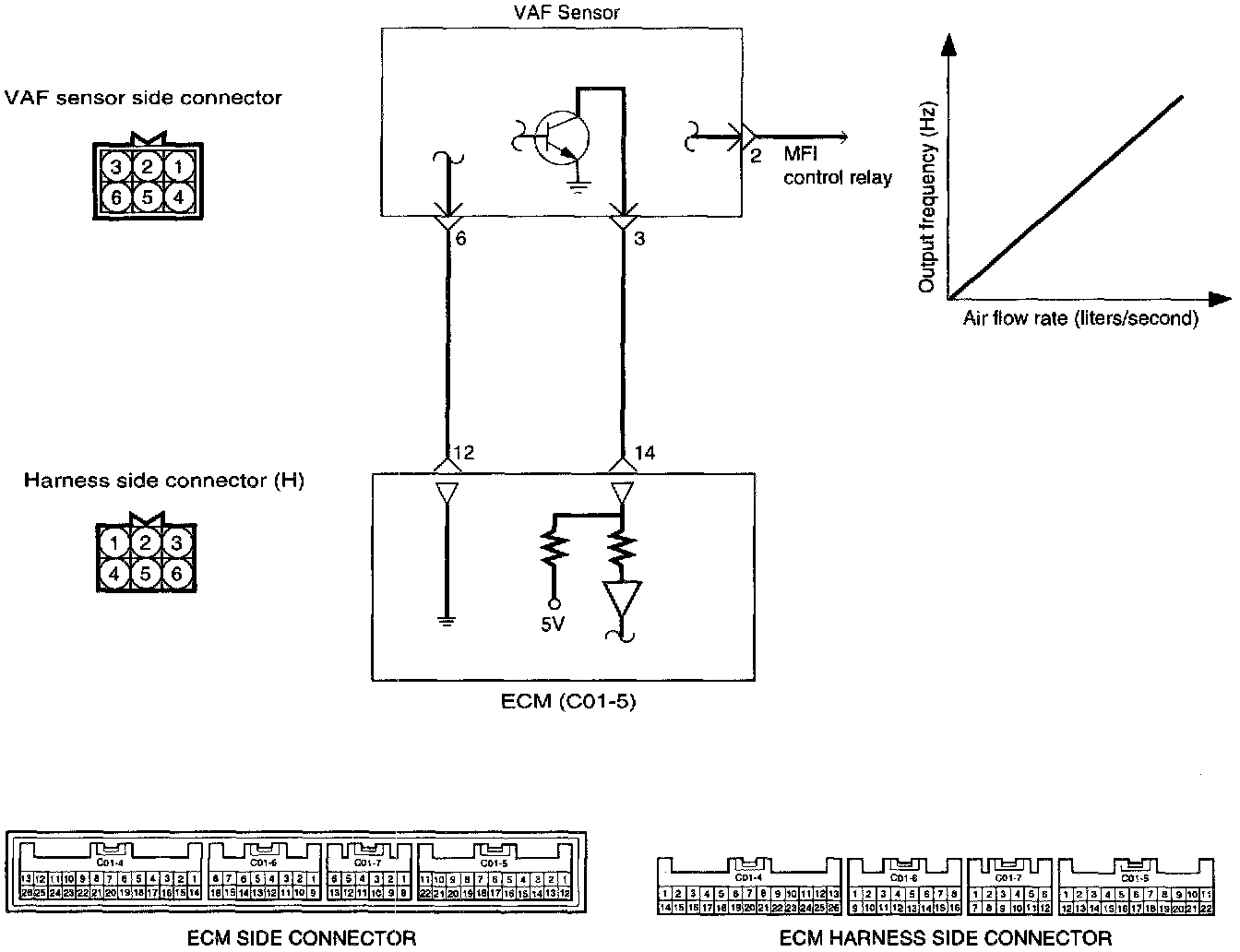 2. If the VAF Sensor output frequency is other than 0 when the ignition switch is turned on (do not start the engine), check for the faulty VAF Sensor of ECM.