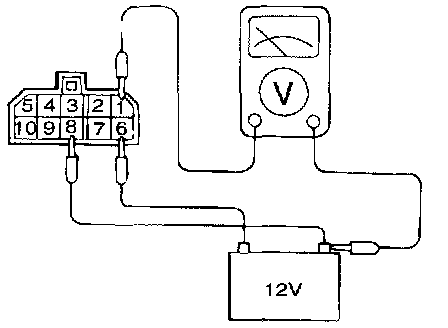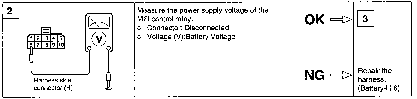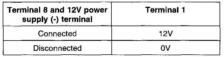 1. Connect a 12V power supply (+) terminal to terminal 6 of the MFI control relay and measure the voltages at terminal 1 when the (-) terminal is connected to and disconnected from the terminal 8.