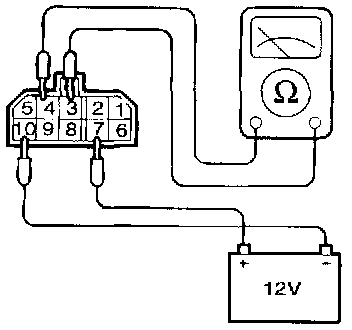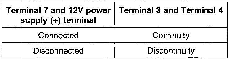 2. Connect a 12V power supply (-) terminal to terminal 10 of the MFI control relay and check the continuity between terminals 3 and 4 when the (+) terminal is connected to and disconnected from the terminal 7.