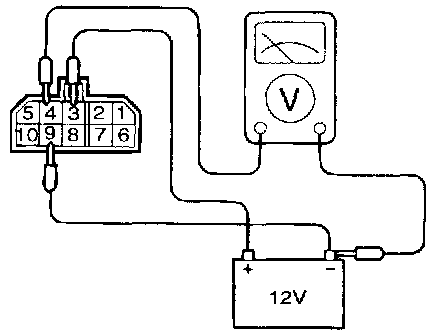 3. Connect a 12V power supply (+) terminal to terminal 3 of the MFI control relay. Measure the voltages at terminal 4 when the (-) terminal is connected to and disconnected from the terminal 9.