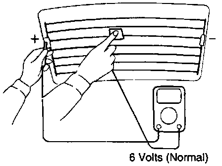1. Turn ON the defogger switch and use a voltmeter to measure the voltage of each heater line at the glass center point. If a voltage of approximately 6 V is indicated by the voltmeter, the heater line of the rear window is considered satisfactory.
