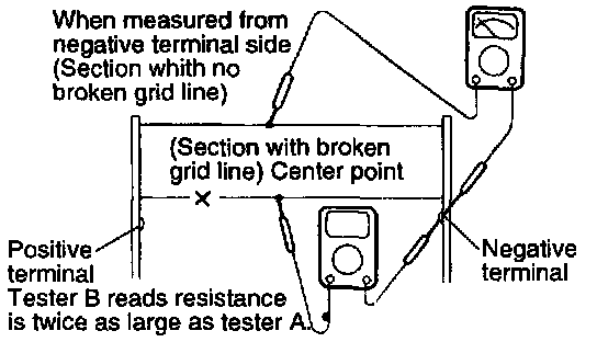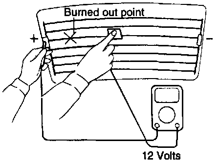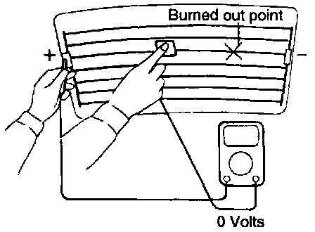 5. Use an ohmmeter measure the resistance of each heater line between a terminal and the center of a grid line and between the same terminal and the center of one adjacent heater line after another. The section involving a broken heater line indicates resistance twice as that in other section. In the affected section, move the test lead to a position where resistance sharply changes.