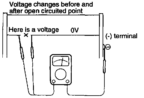 4. To check for open circuits, slowly move the test lead in the direction that the open circuit seems to exist. Try to find a point where a voltage is generated or changes to 0 V. The point where the voltage has changed is the open-circuited point.