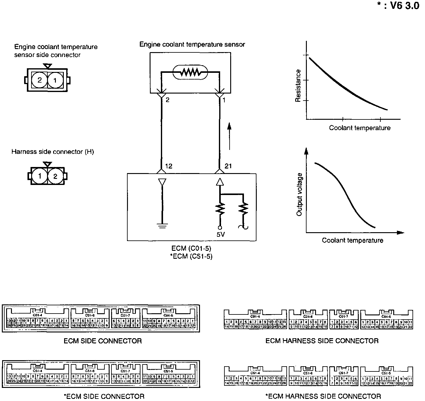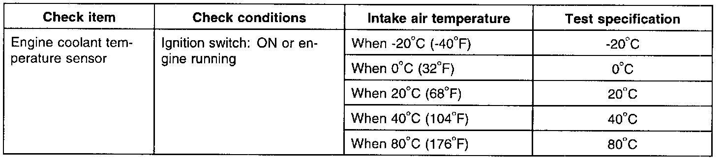 The engine coolant temperature sensor is installed in the engine coolant passage of the cylinder head. The ECM judges engine temperature by the sensor output voltage and provides optimum fuel enrichment when the engine is cold.