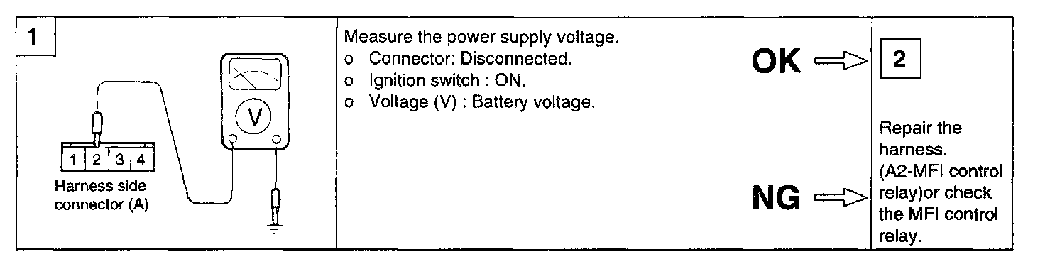 2. If the MAF sensor output voltage is other than 0 when the ignition switch is turned on (do not start the engine). Check for the faulty MAF sensor or ECM.