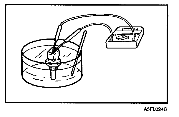 2. With temperature sensing portion of engine coolant temperature sensor immersed in hot water, check resistance.