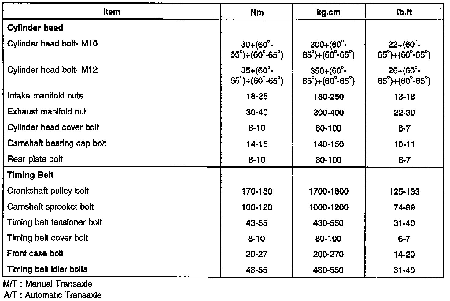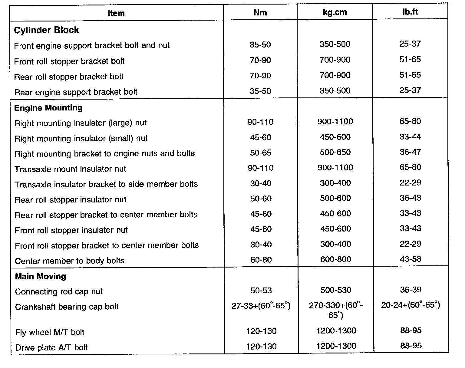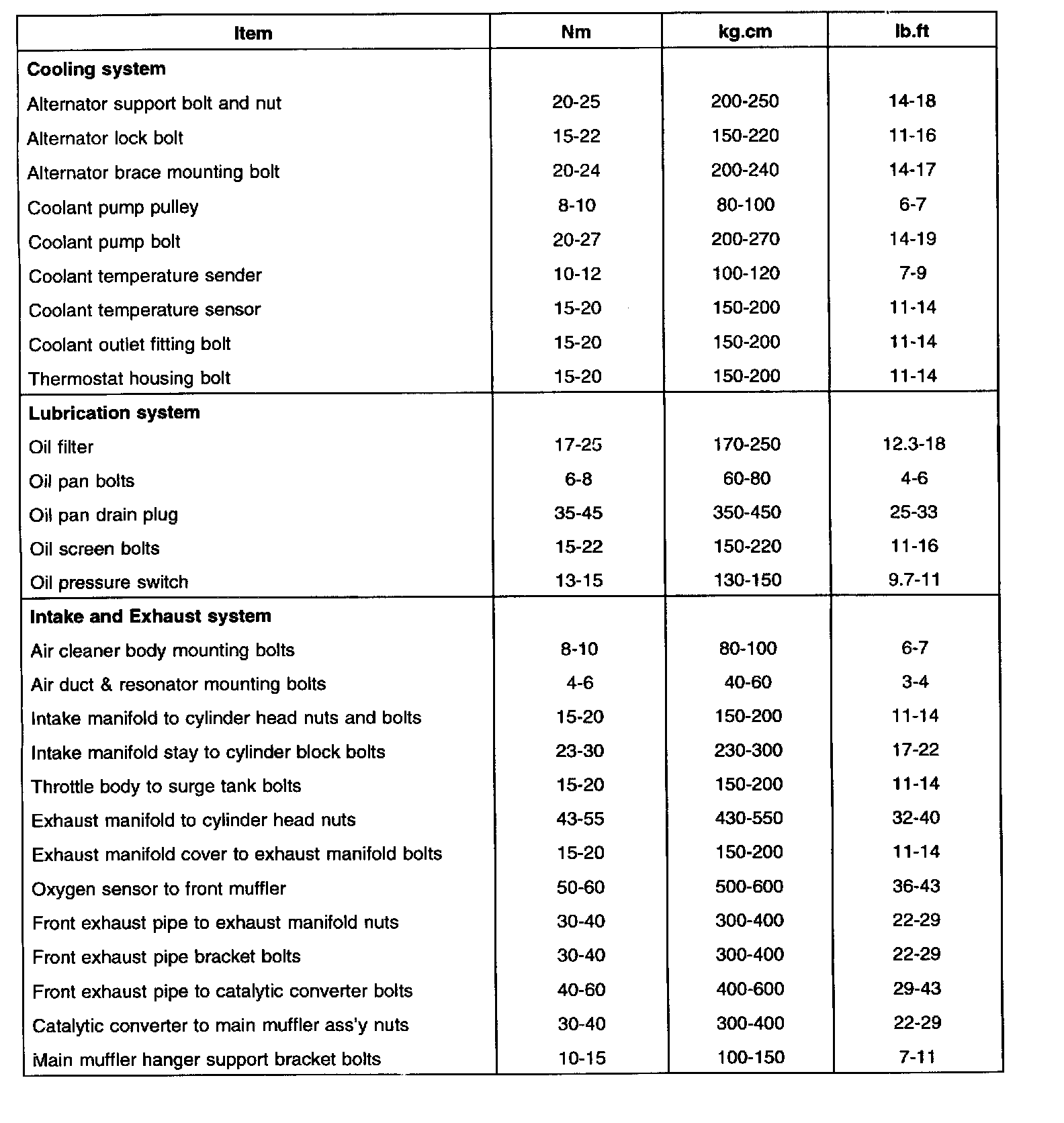 Home >> Hyundai >> 2000 >> Tiburon L4-2.0L >> Repair and Diagnosis >> Specifications >> Mechanical Specifications >> Engine >> System Specifications >> Tightening Torque Specifications