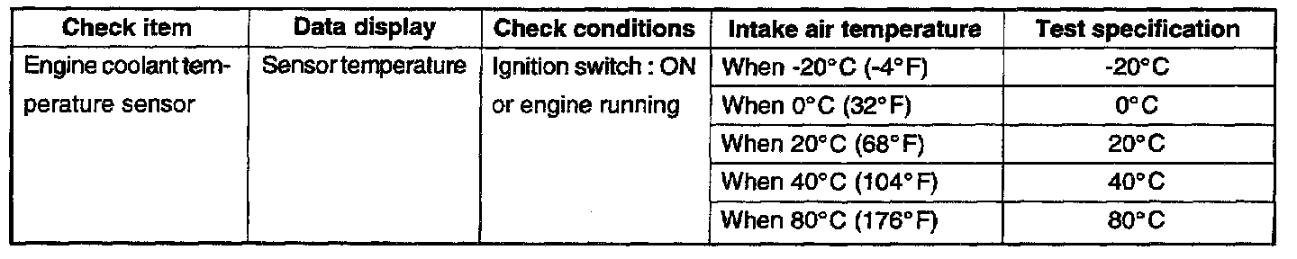 The engine coolant temperature sensor is installed in the engine coolant passage of the cylinder head, detects engine coolant temperature and emits signals to the ECM. This part employs a thermistor which is sensitive to changes in temperature. The electric resistance of a thermistor decreases in response to temperature rise. The ECM judges engine coolant temperature by the sensor output voltage and provides optimum fuel enrichment when the engine is cold.