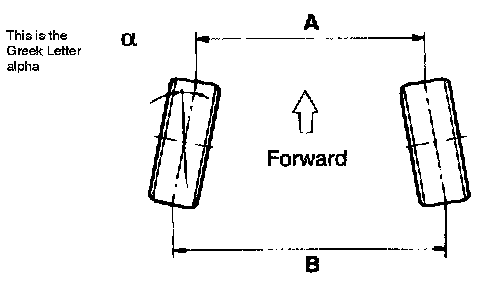 Toe-in (B-A or angle a) is adjusted by turning the tie rod turnbuckles. Toe in on the left front wheel can be reduced by turning the tie rod toward the rear of the car. Toe change is achieved by turning the tie for the right and left wheels simultaneously the same amount as follows: