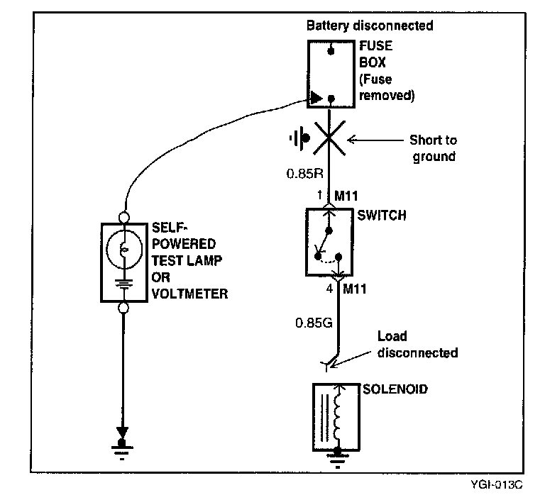 5. When the self-powered test lamp glows, or ohmmeter registers, there is a short to a ground in the wiring near that point.