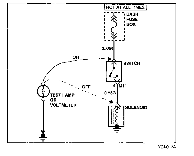 1. Connect one lead of a test lamp or voltmeter to a ground. If you are using a voltmeter, be sure it is the voltmeter's negative test lead you have connected to ground.