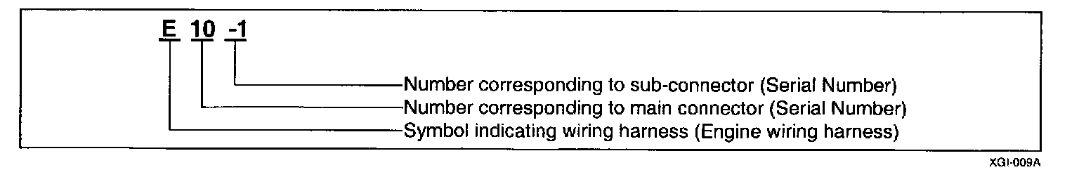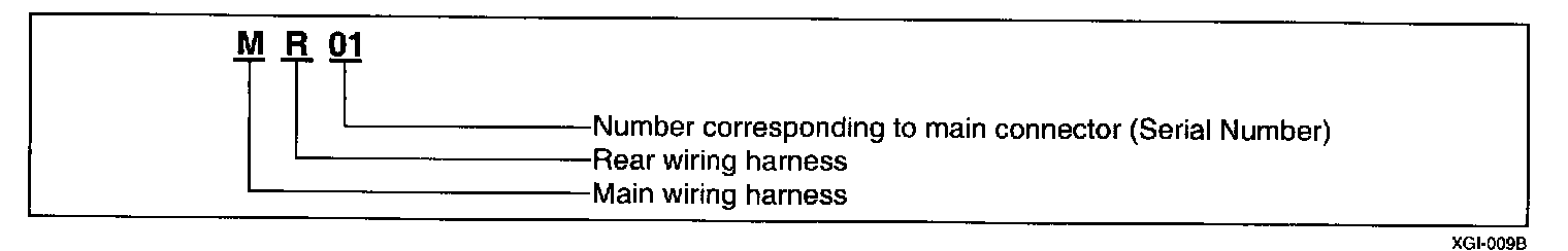 A connector identification symbol Consists of a wiring harness location classification symbol corresponding to a wiring harness location and number corresponding to the connector. These connector locations can be found in the HARNESS LAYOUTS.