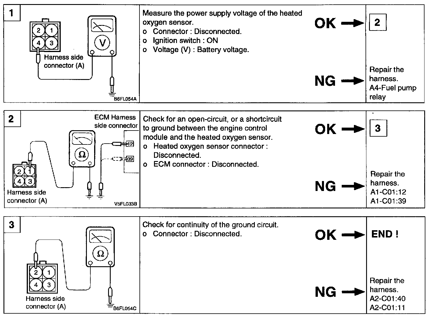 When you suddenly press the accelerator pedal, the voltage will reach 'B' range. Then, when you let the engine idle again, the voltage fluctuates between 'A' and 'B' range. In this case, the O2 sensor can be determined as good.