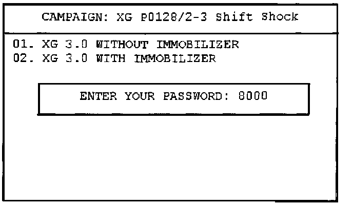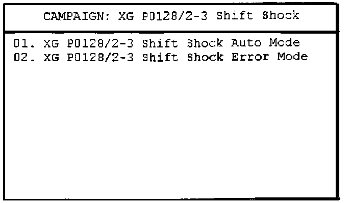 In the event menu option "01. XG P0128/2-3 Shift Shock Auto Mode" fails to download the new program, option "02. XG P0128/2-3 Shift Shock Error Mode" must be used.Confirm all connections are established as shown in the "AUTOMATIC UPDATE PROCEDURE" before continuing.