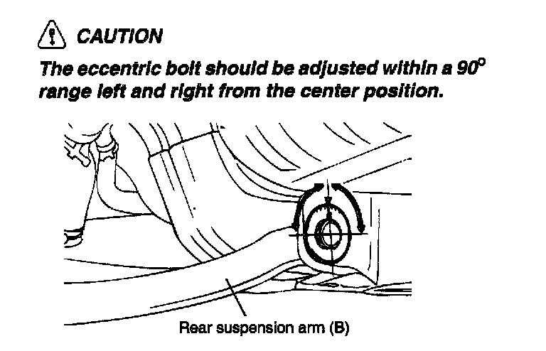 NOTE: The rear suspension arm (B) mounting bolt should be turned an equal amount on both sides when adjusting.