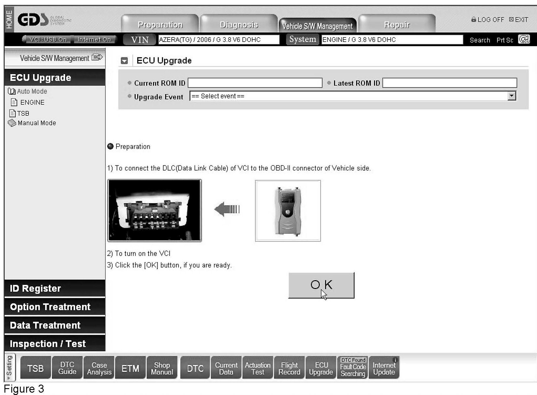 The GDS will prompt you to make sure that you have connected the VCI to the DLC and turned on the VCI power. (See Figure 3.) After making sure, click "OK."