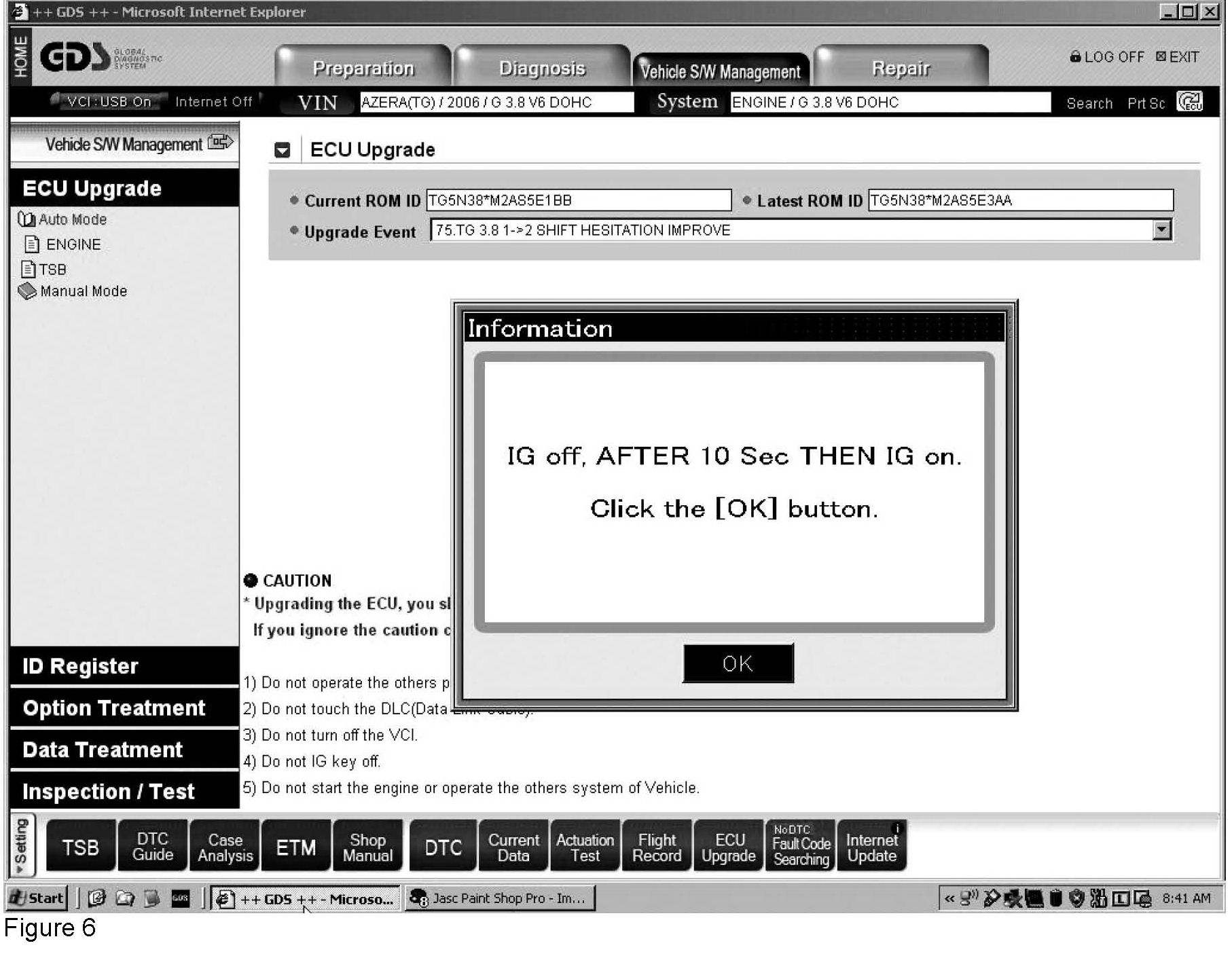 This issue of TechNet Times focuses on reprogramming. In the current Hyundai service environment, reprogramming can be accomplished with the Hi-Scan Pro or Hyundai's new Global Diagnostic System (GDS). We begin here with an overview of the process of reprogramming the ECU as performed using the GDS on a 2006 Azera that experiences a 1-2 shift hesitation under wide open throttle operation when cold. As with most GDS features, you must select the model, year and system in order to get started. You can manually enter the information by selecting drop-down box options or, if the vehicle is a 2005 or newer model, you can enter the VIN and the GDS will determine that information for you. Once the vehicle has been identified, select "ECU Upgrade" located under the "Vehicle SW Management" tab. (See Figure 1.) Note: The Vehicle Communication Interface (VCI) connects to the vehicle via the Data Link Connector (DLC); and the VCI must be connected to the GDS PC using the USB connection. (Some other GDS functions allow for wireless communication between the VCI and GDS PC.)