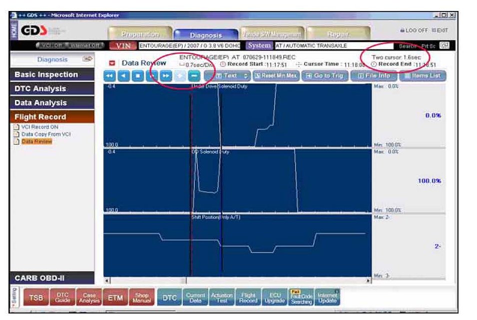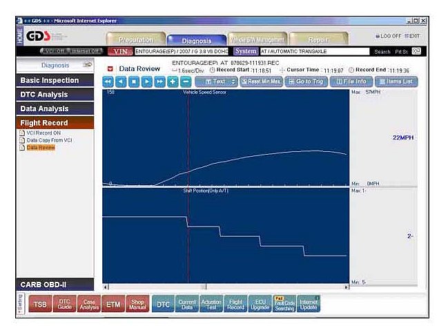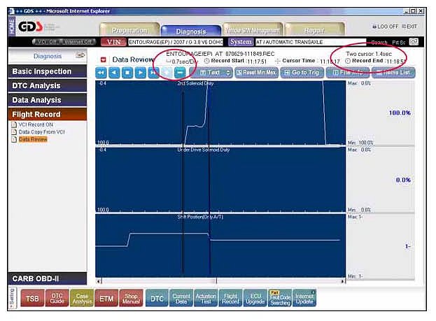 Open the GDS program and select: VIN and "A/T", "Flight Record" and "Data Review"