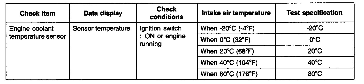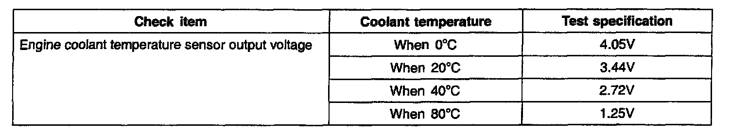 The engine coolant temperature sensor installed in the engine coolant passage of the cylinder head detects the engine coolant temperature and emits signals to the ECM. This part employs a thermistor which is sensitive to changes in temperature. The electric resistance of the thermistor decreases in response to a temperature rise. The ECM determines engine coolant temperature by the sensor output voltage and provides optimum fuel enrichment when the engine is cold.