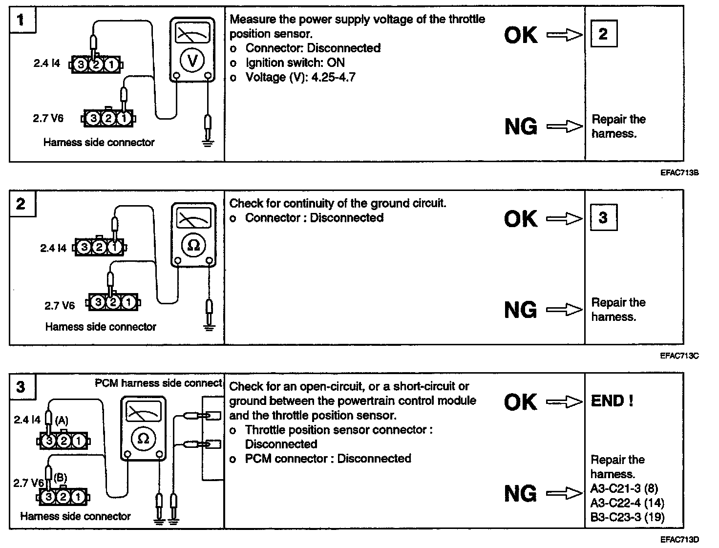 5. If the resistance is out of specification, or fails to change smoothly, replace the throttle position sensor.