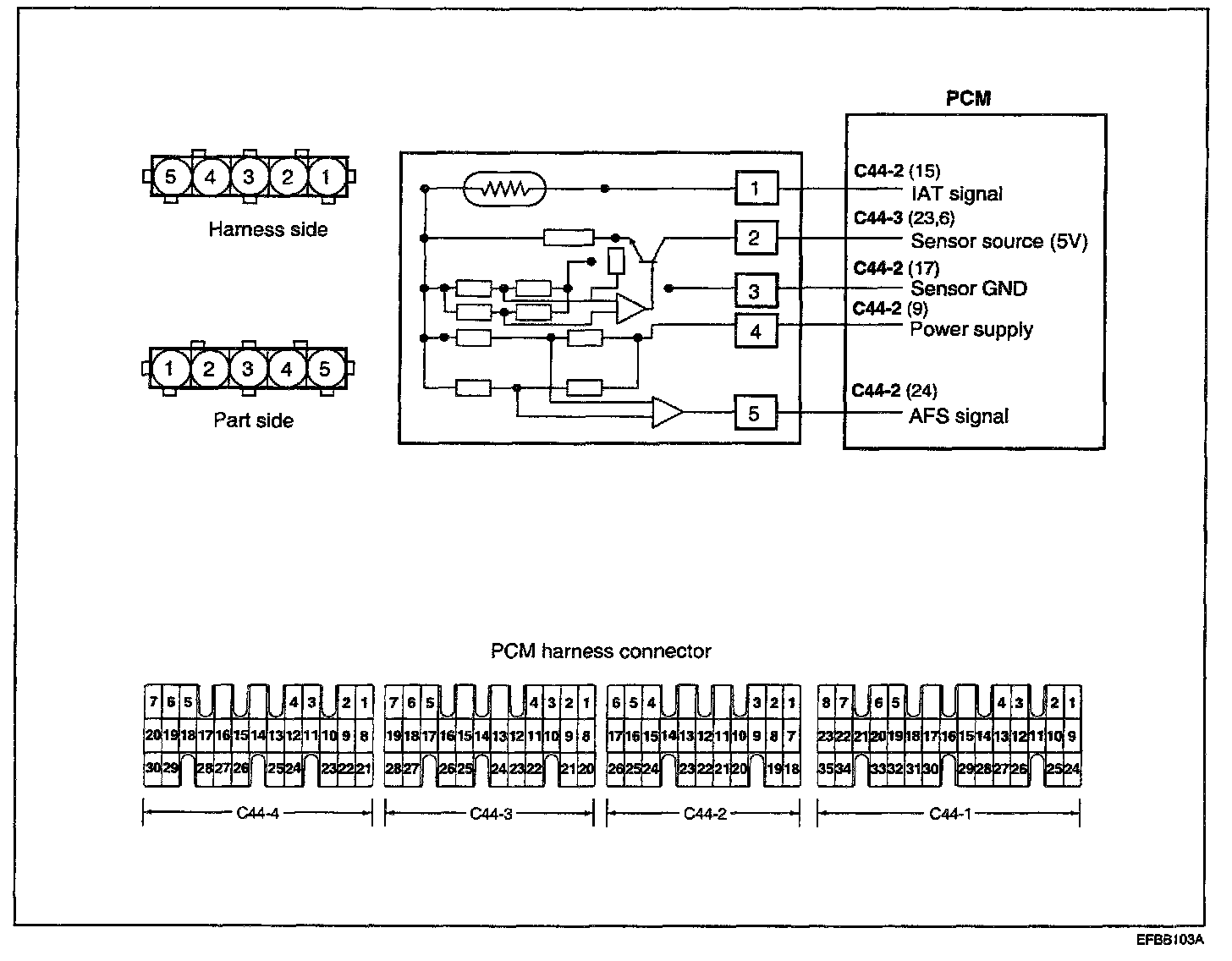 MASS AIR FLOW(MAF) SENSOR & INTAKE AIR TEMP.(IAT) SENSORThis hot film type air flow sensor is composed of a hot film sensor, housing and metering duct (hybrid sensor element). Mass air flow rate is measured because the change of the mass air flow rate causes a change in the amount of heat being transferred from the hot film probe surface to the air flow. The air flow sensor generates a pulse so it repeatedly opens and closes between the 5 V voltage supplied from the powertrain control module.