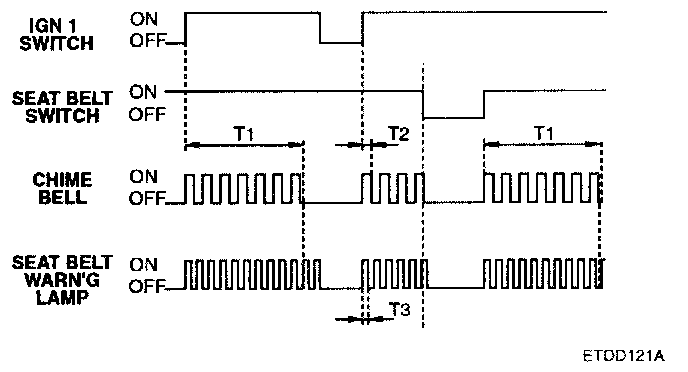 1. Since the ignition is switched ON, the seat belt warning indicator is illuminated infinitely (with period : 0.6 sec., duty rate : 50%) and the chime bell is sounded (with period : 0.9 sec., duty rate 50%) for total time 6 seconds.