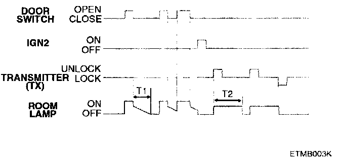 5. With keyless UNLOCK, when the door is closed, the room lamp is turned ON, then OFF after about 30 seconds. While the room lamp is ON due to keyless UNLOCK, if another UNLOCK is received, the room lamp is again ON for 30 seconds.