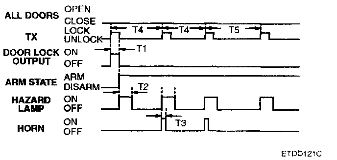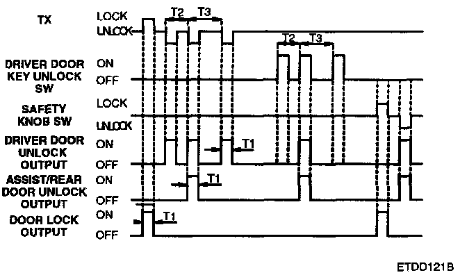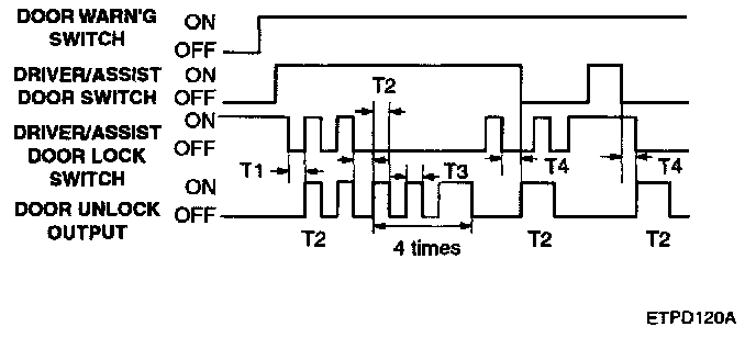 3. Within 4 sec. since final unlock signal, it TX unlock or key unlock signal is received again, all doors unlock output is ON at driver door unlock state.