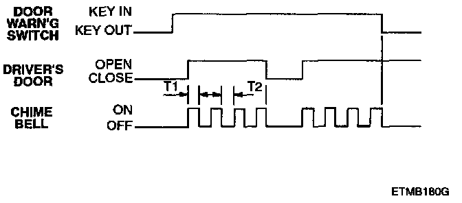 1. If the key is in the ignition key cylinder and the driver's door is opened, the chime bell sounds continually (period: 0.9 sec. Duty rate:50%).