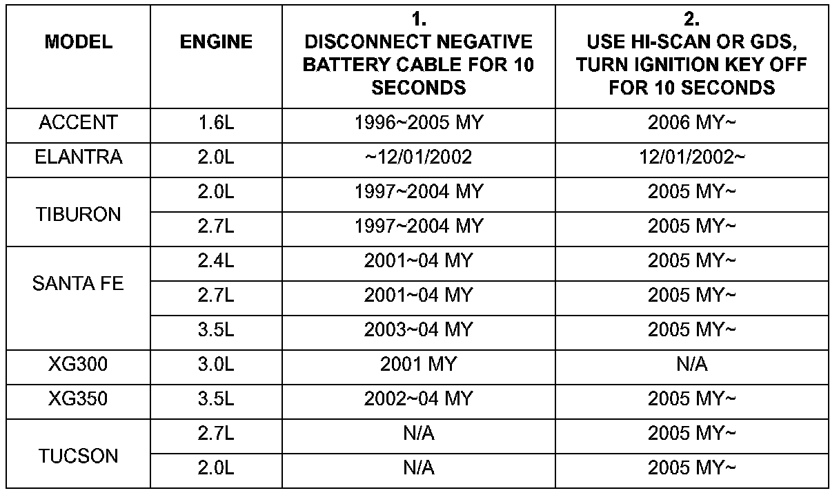 Adaptive values must be reset using procedure # 1 or # 2 according to model and model year (MY) as shown below.