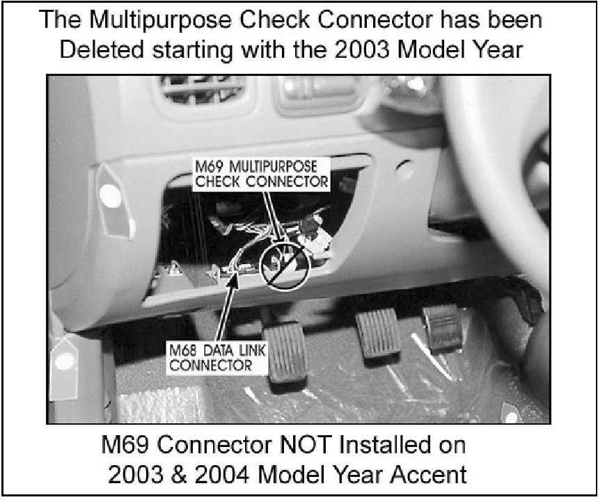 The Multipurpose Check Connector (Connector # M69) has been deleted from the Accent beginning with the 2003 Model Year.