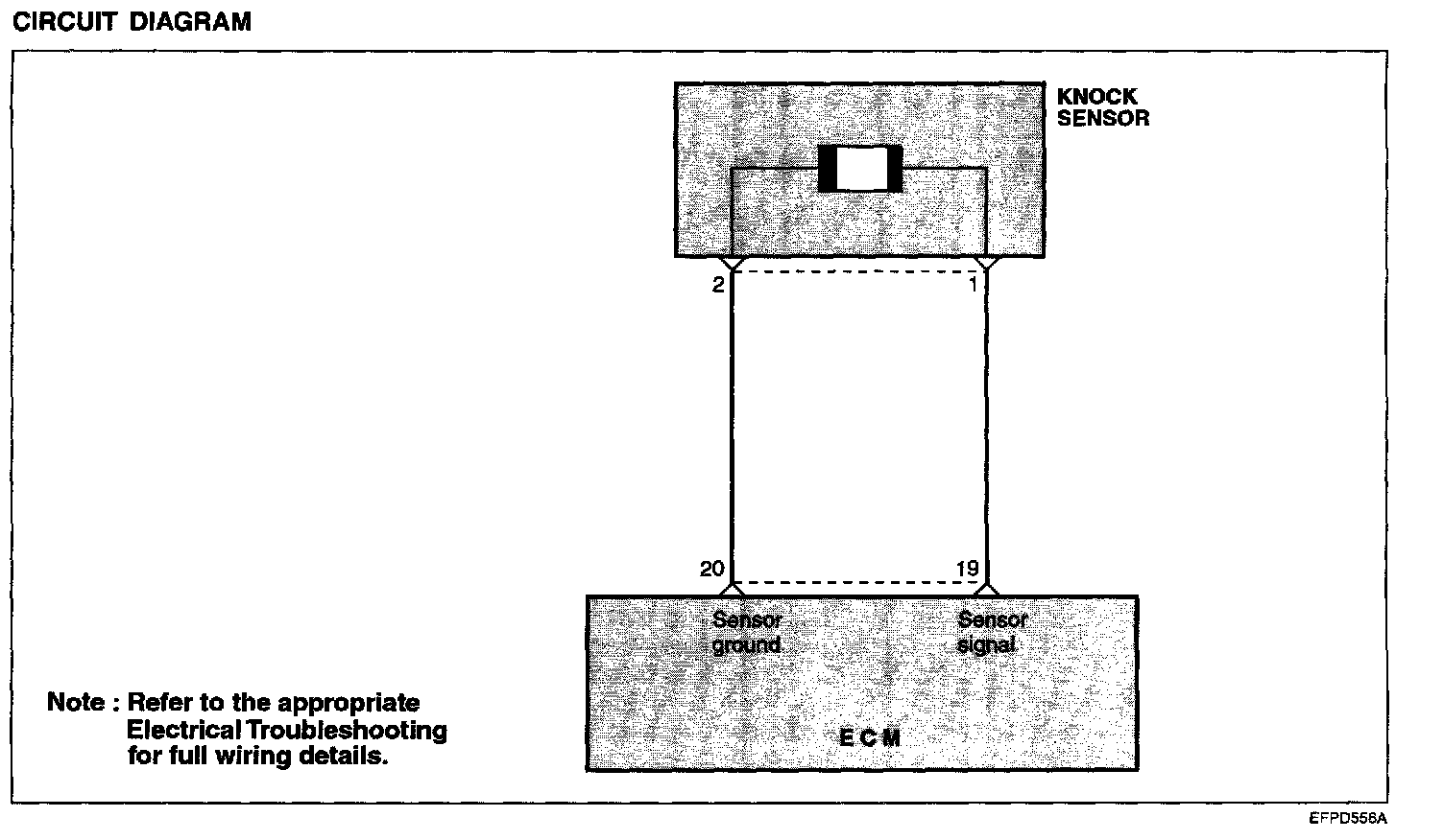 The knock sensor is attached to the side of the cylinder block to sense engine knocking. A knocking vibration from the cylinder block is applied as pressure to the piezoelectric element. This vibrational pressure is then converted into a voltage signal which is relayed to the ECM. If engine knocking occurs, ignition timing is retarded to suppress it.