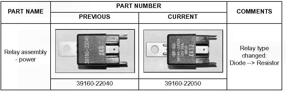 On MY Accent vehicles, the engine control module (ECM) main power relay type located under the main dash pad has been changed.
