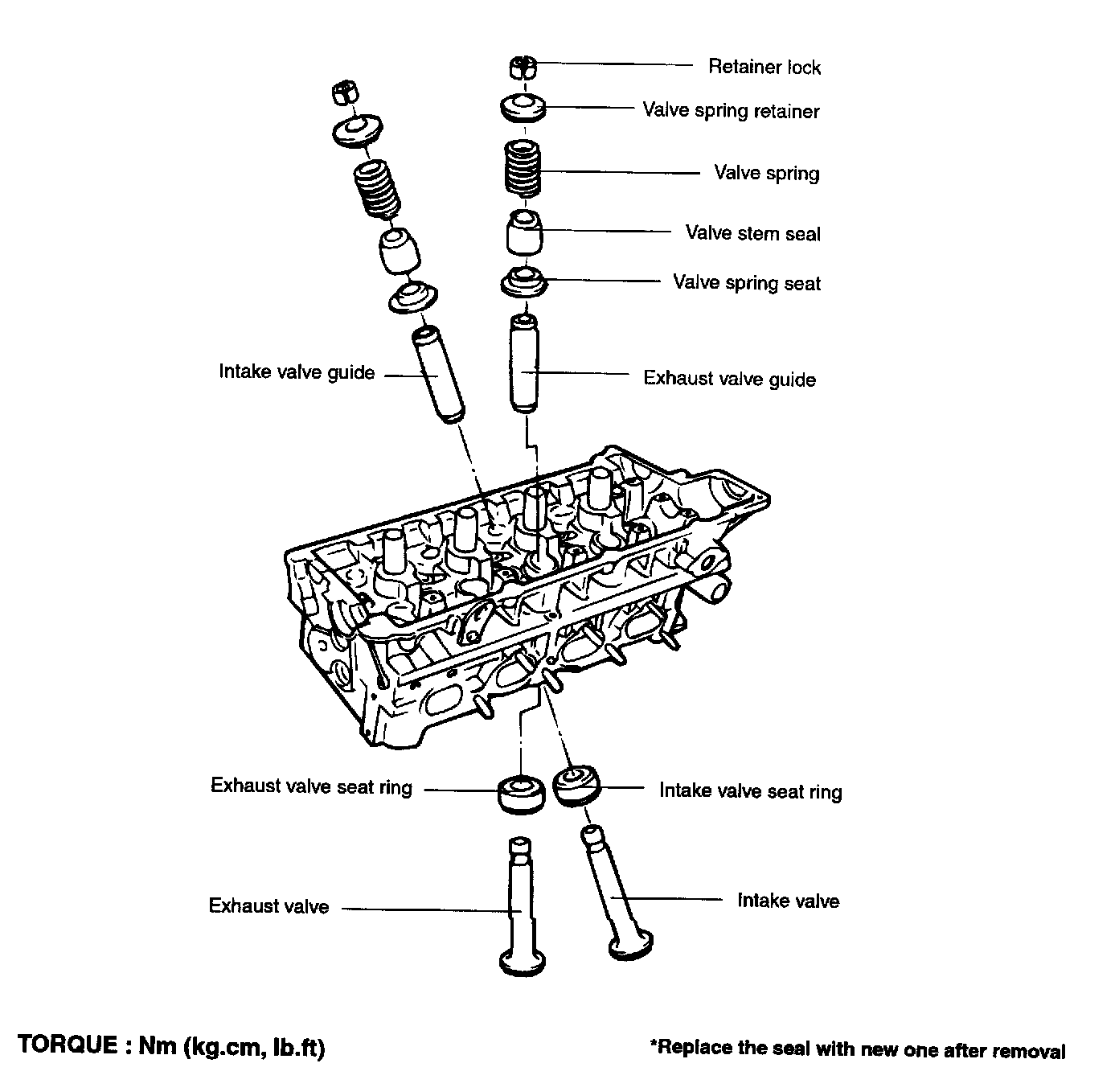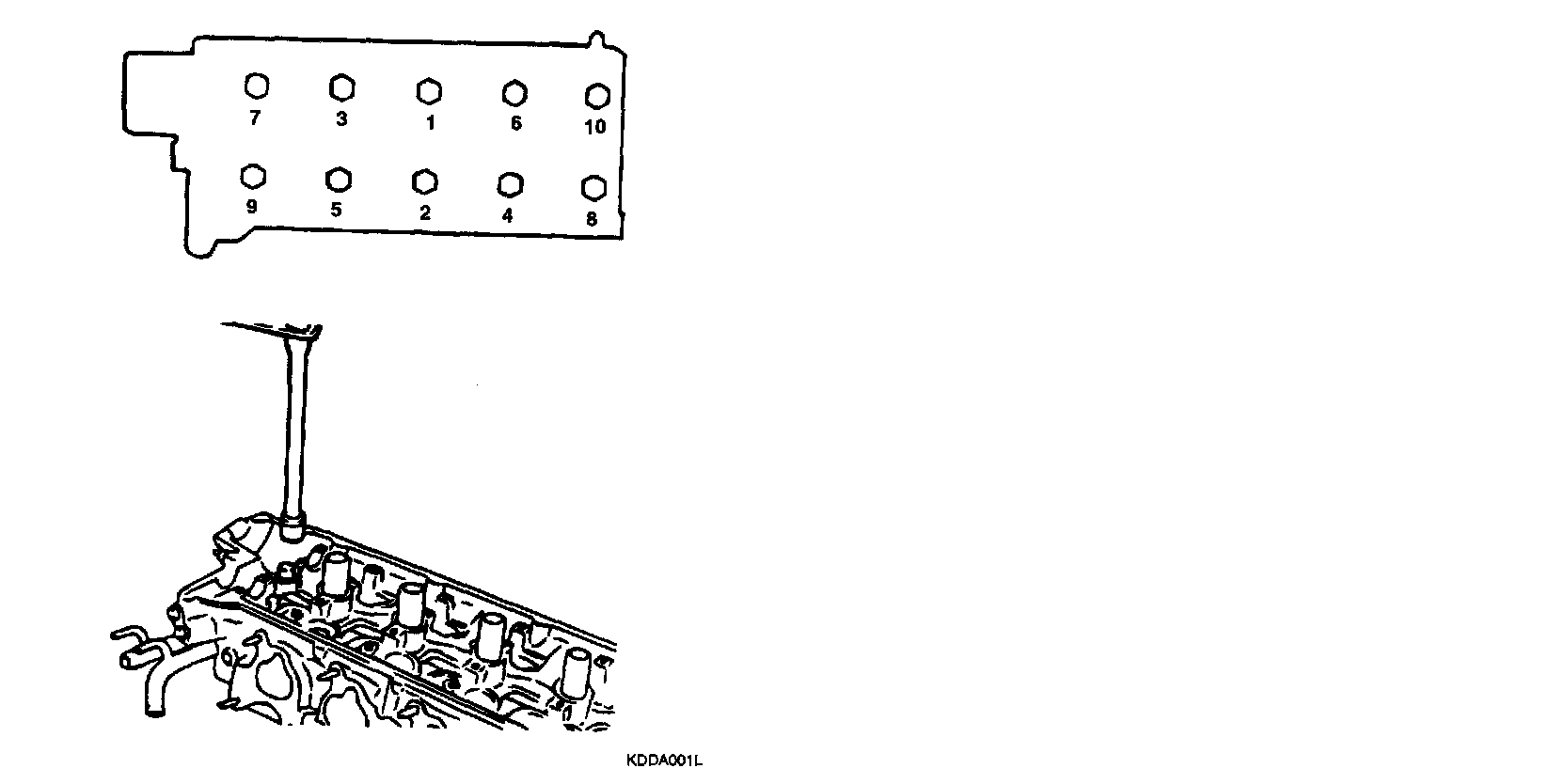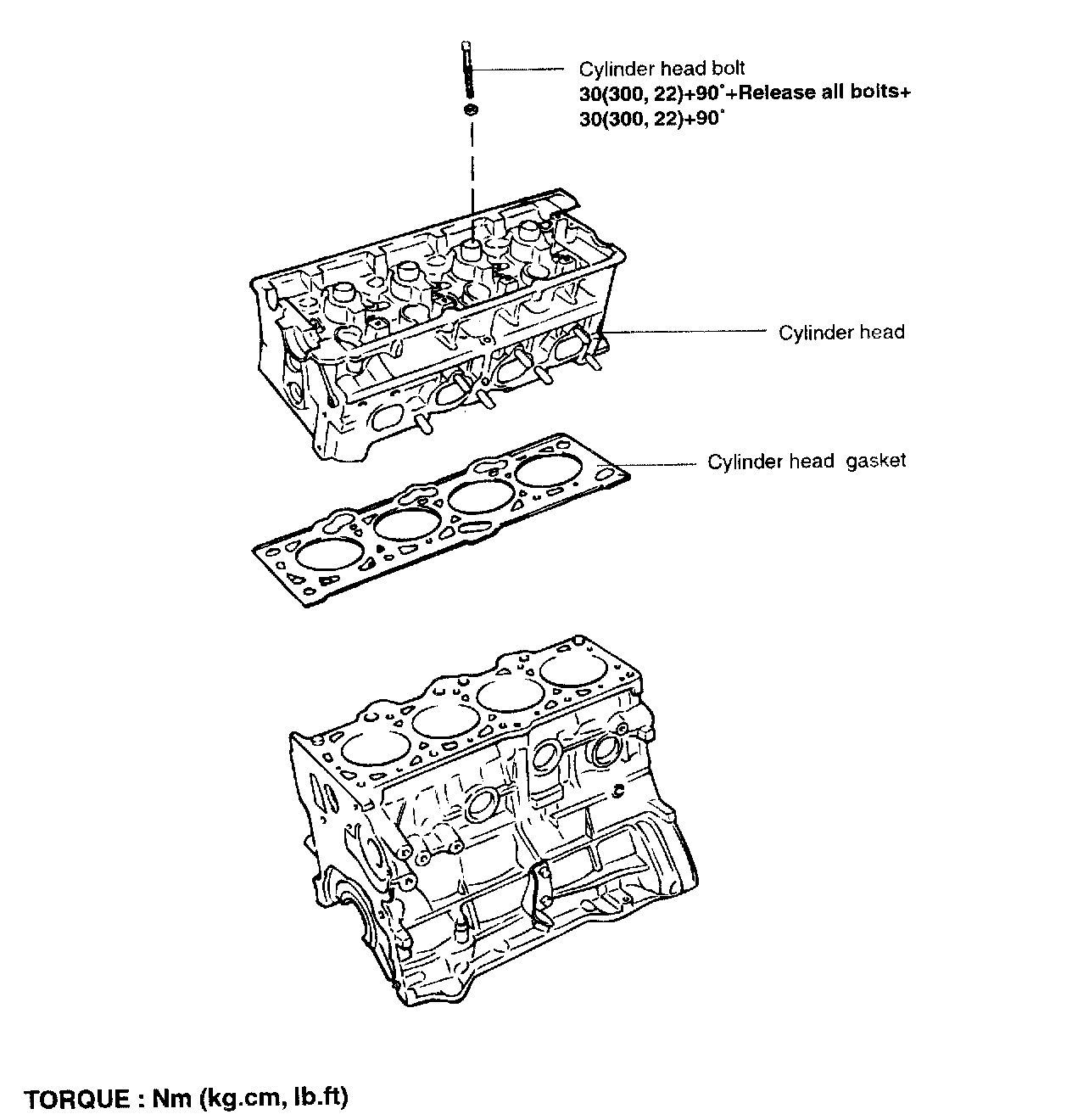 Cylinder head bolt; 30 Nm +(90°) + Release all bolts + 30 Nm +(90°) [300 Kg.cm +(90°) + Release all bolts + 300 Kg.cm +(90°), 22 ft. lbs. +(90°) + Release all bolts + 22 ft. lbs. +(90°)]