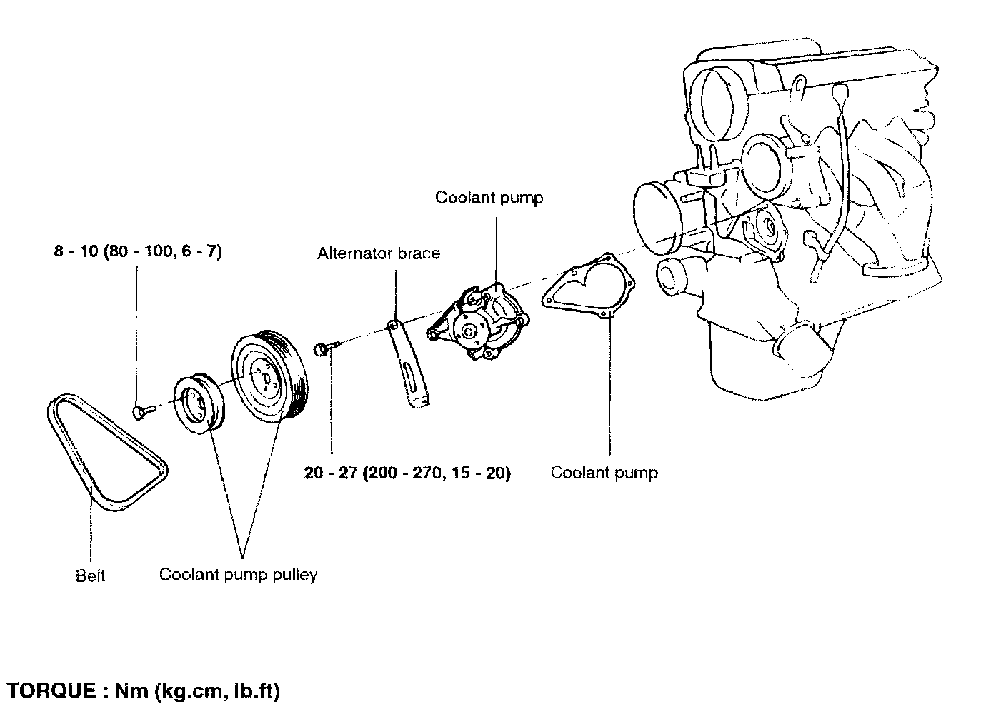Coolant pump pulley 8-10 Nm (80 - 100 kg-cm, 6 - 7 ft. lbs.)