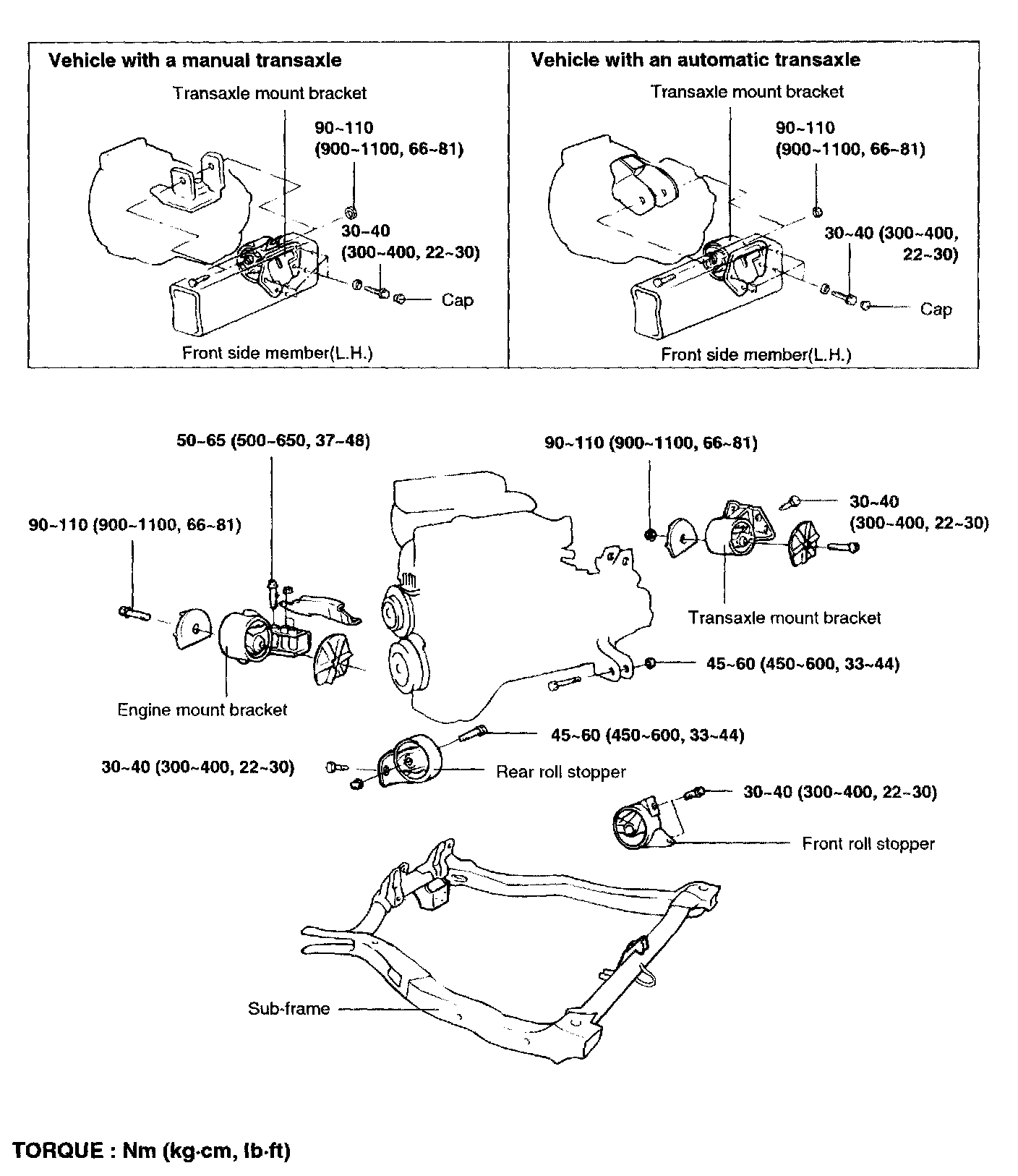 Rear roll stopper bracket to sub frame bolt:..........30-40 Nm (300-400 kg-cm, 22-31 ft. lbs.)