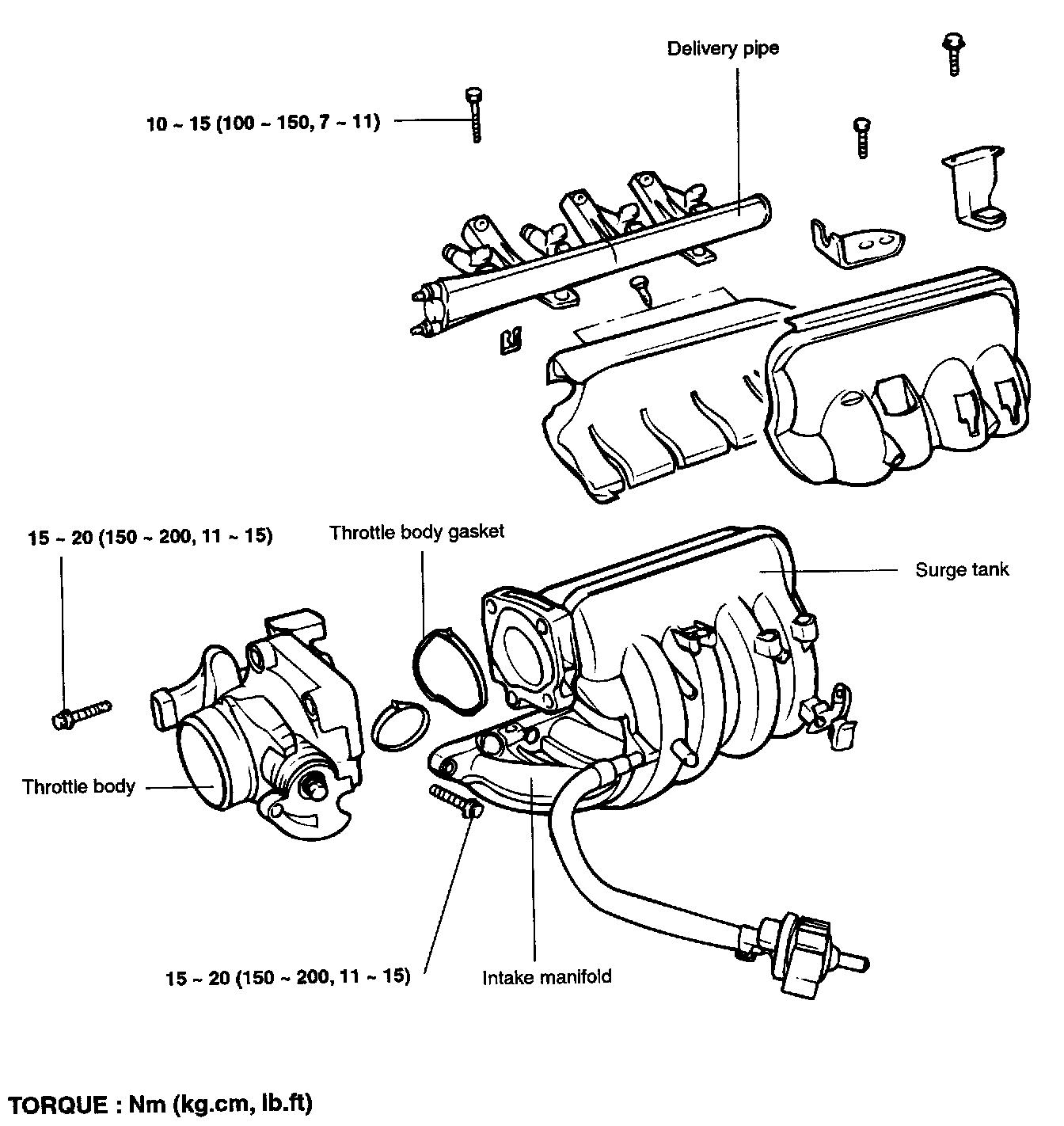 Throttle body to surge tank nuts......15-20 Nm (150-200 kg-cm, 11-14 ft. lbs.)