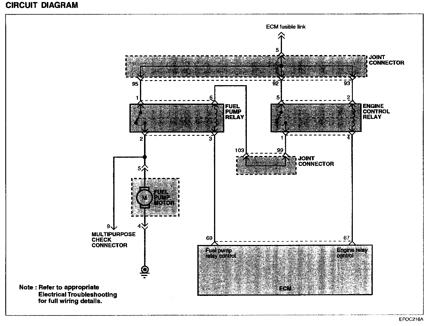 MFI CONTROL RELAYWhen the ignition switch is on, battery power is supplied to the ECM, the injectors, the mass air flow sensor, etc. While the ignition switch is turned on, current flows from the ignition switch through the current relay coil to ground.