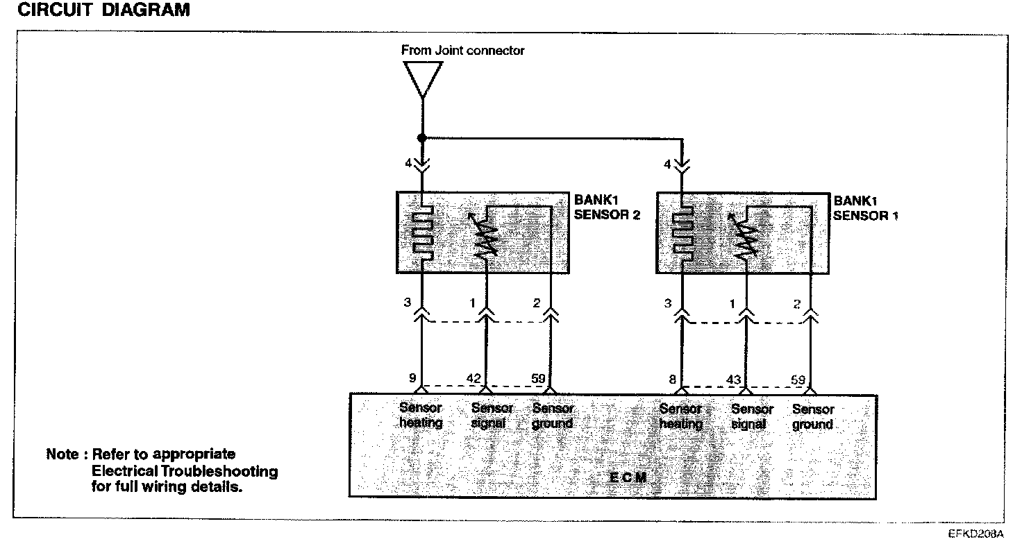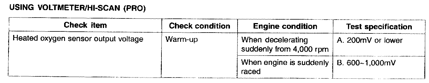 NOTE: If you release the accelerator pedal suddenly after engine running about 4000 rpm, fuel supply will stop for short period and the O2 sensor service data in the HI-SCAN (Pro) will display values 200 mV or lower. When you suddenly press on the accelerator pedal down, the voltage will reach 600-1000 mV