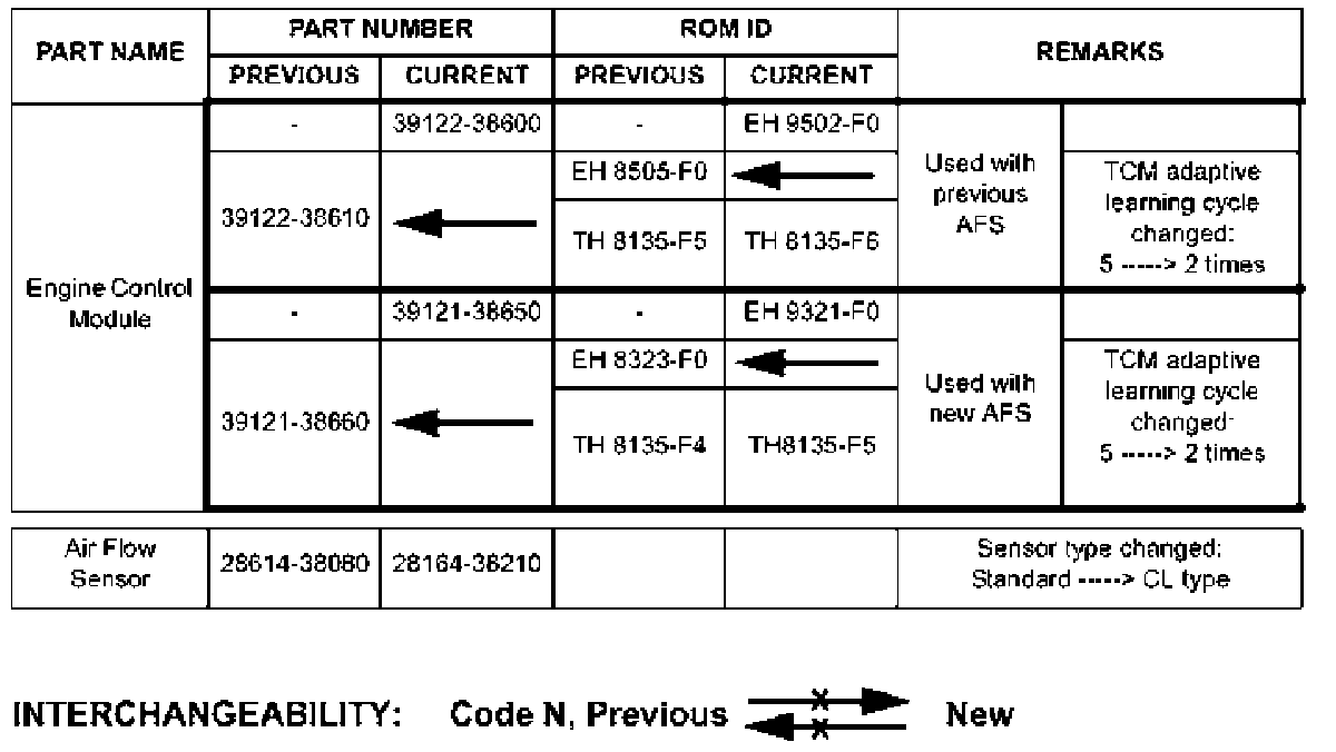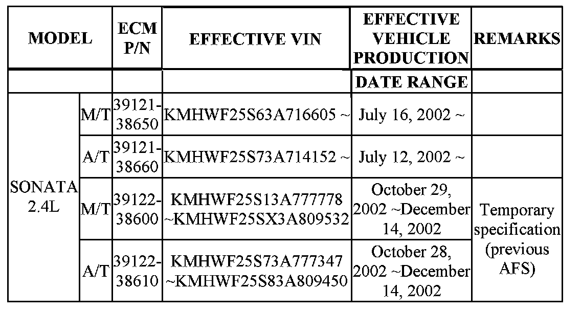 This bulletin provides engine control module (ECM) and air flow sensor (AFS) part application information for the 2003 MY Sonata 2.4L vehicle.