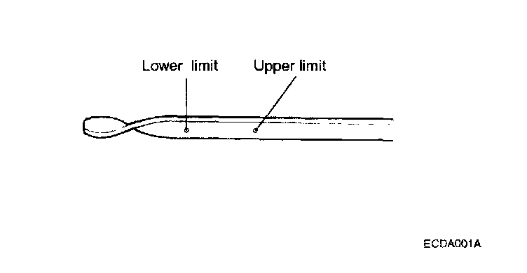 4. Check that the engine oil level is within the level range indicated on the oil dipstick. If the oil level is found to have fallen to the lower limit (the "L"mark), refill to the "F" mark.