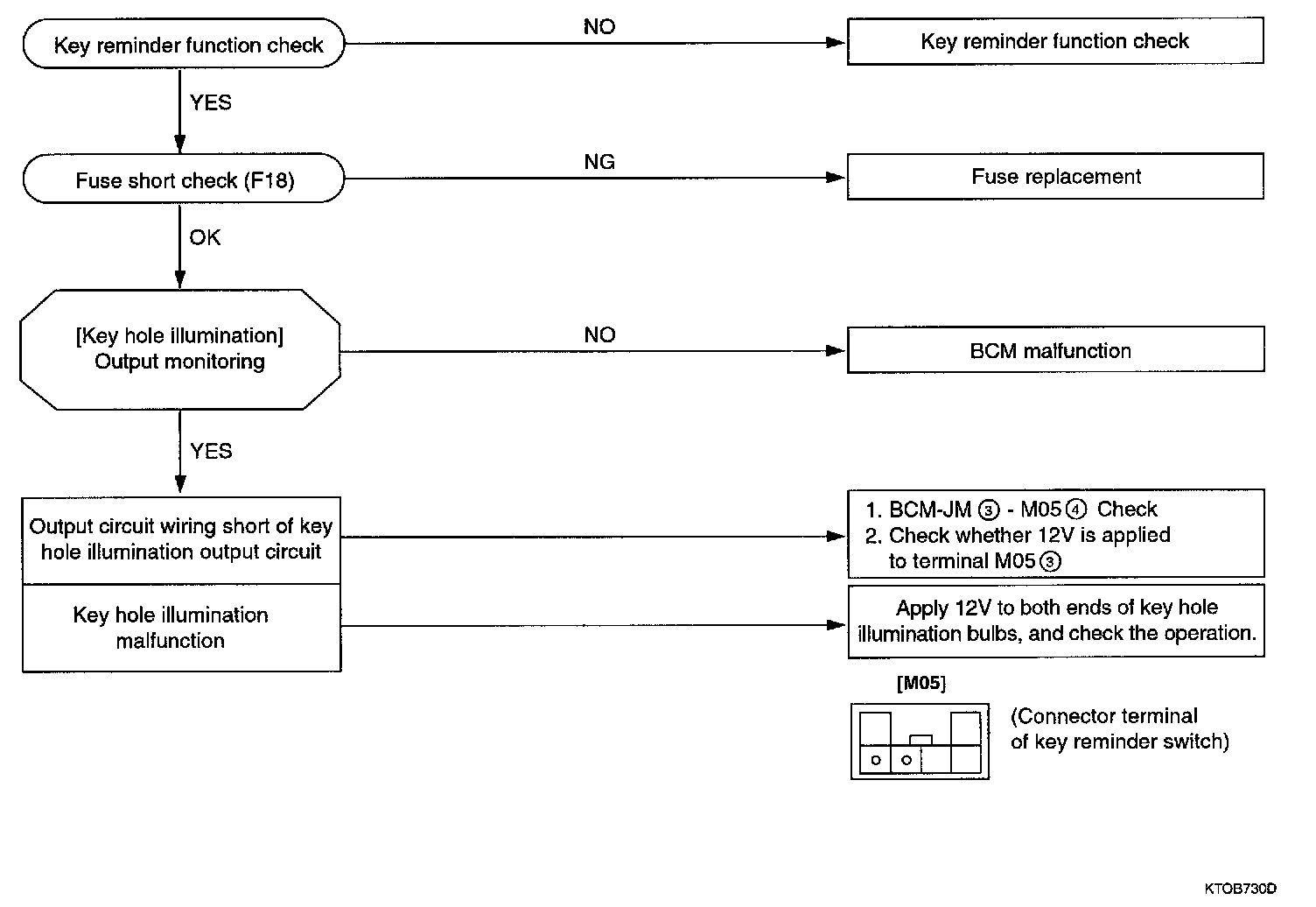 IGNITION KEY HOLE ILLUMINATION1. Function explanation When driver's side door is opened and closed ignition key hole illumination turns on for 10 seconds so that the driver can insert the key.