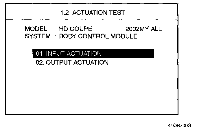 6. If you want forced drive of BCM input factors, select "01 INPUT ACTUATION" after selecting "02.ACTUATION TEST".