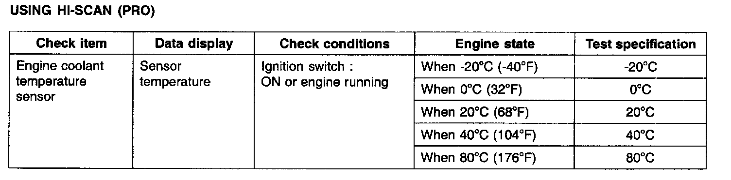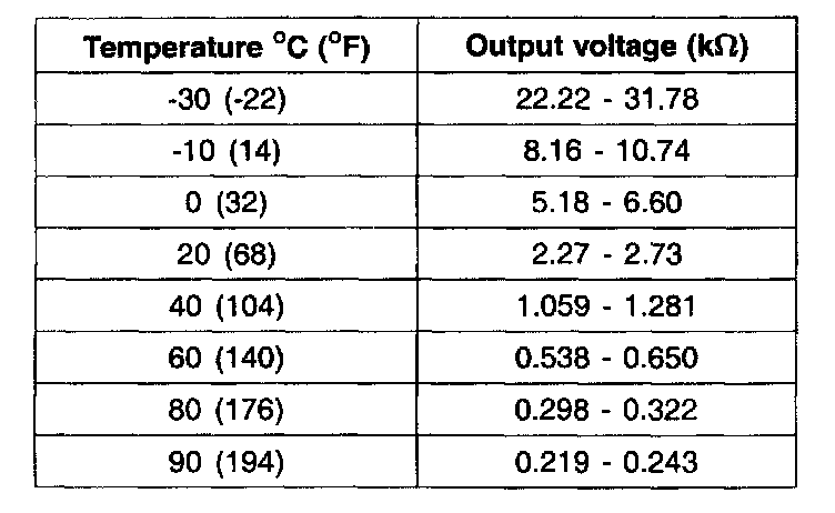 The engine coolant temperature sensor, located in the engine coolant passage of the cylinder head. It detects the engine coolant temperature and relays signals to the ECM. It employs a thermistor which is sensitive to changes in temperature. The electric resistance of a thermistor decreases in response to temperature rise. The ECM judges engine coolant temperature by the sensor output voltage and provides optimum fuel enrichment when the engine is cold.