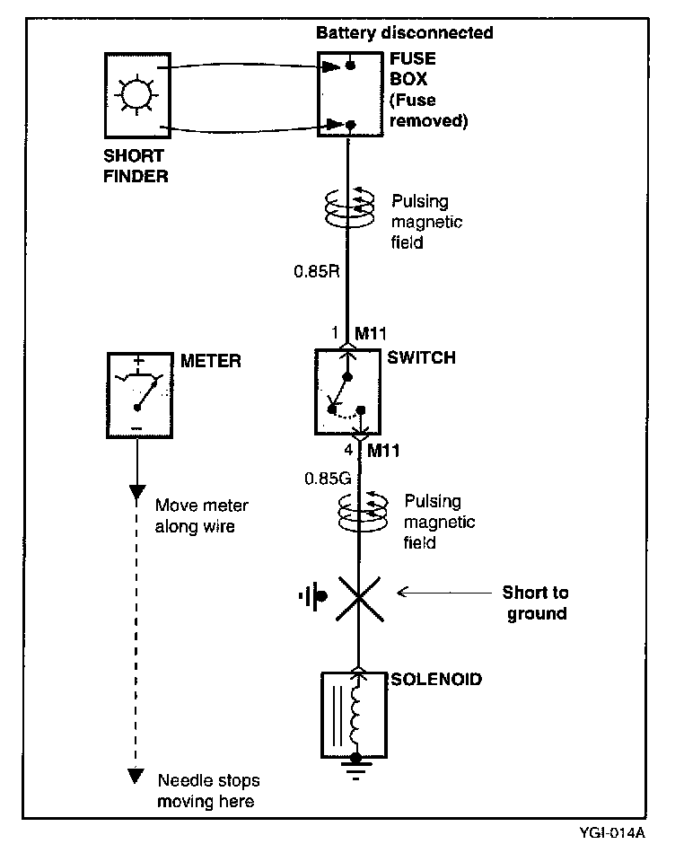 e. Beginning at the fuse box, slowly move the short finder along the circuit wiring. The meter will show current pulses through sheet metal and body trim. As long as the meter is between the fuse and the short, the needle will move with each current pulse. Once the meter is moved past the point of the short, the needle will stop moving. Check around this area to locate the cause of the short circuit.