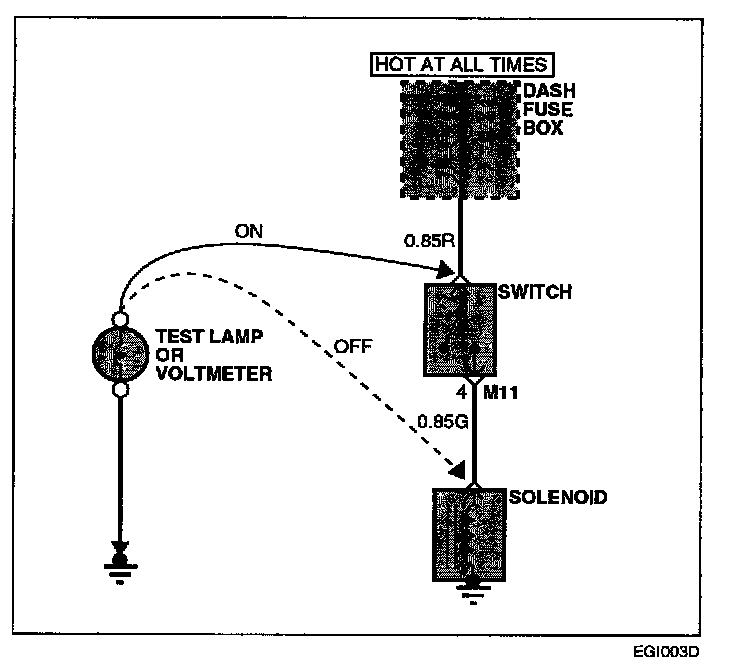 a. Connect one lead of a test lamp or voltmeter to a ground. If you are using a voltmeter, be sure it is the voltmeter's negative test lead you have connected to ground.