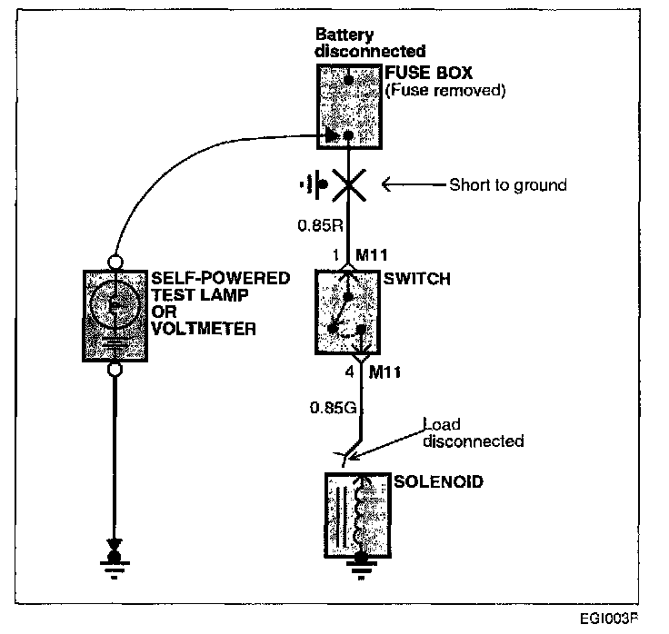 e. When the self-powered test lamp glows, or ohmmeter registers, there is a short to a ground in the wiring near that point.